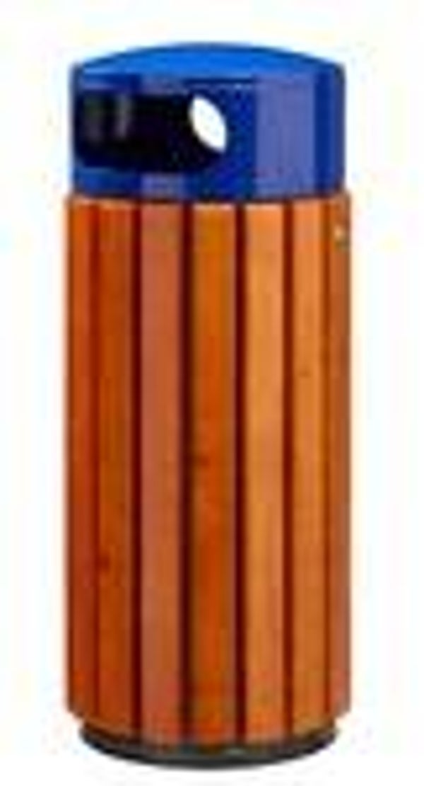 Abfallbehälter Neu mit 40 l. Inhalt rund als gelb, blau, antrazit grau und Holzverkleidung, Einwurf 2 seitig.
